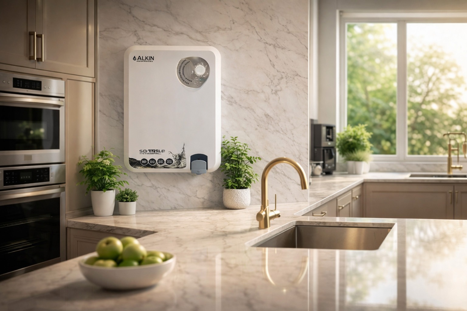 - The sleek and modern design of the Alkin Sparkle not only enhances the aesthetic of your kitchen but also allows for easy installation and maintenance. Its wall-mounted design saves valuable counter space, making it suitable for any kitchen size.